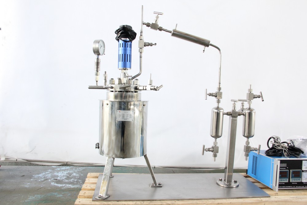 Réacteur de laboratoire sous pression avec condenseur, *Volume du réacteur : 100 ml à 5 litres. Caractéristiques : Équipé d’un condenseur externe, d’un dispositif de rupture par disque de barbotage, d’un réservoir de réception, d’une vanne haute température et d’un capteur de pression. *Réacteur de laboratoire sous pression / Réacteur sous pression de 1 à 5 litres / Autoclave sous pression
